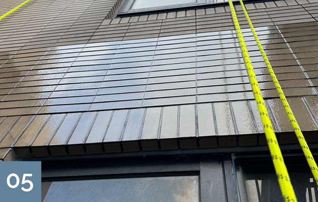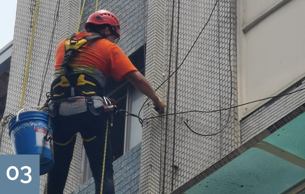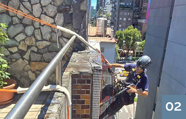 外牆施工,免搭鷹架:採專業雙繩索技術進場,專業蜘蛛人施工靈活、減少鄰里干擾且大幅節省工程成本預算。